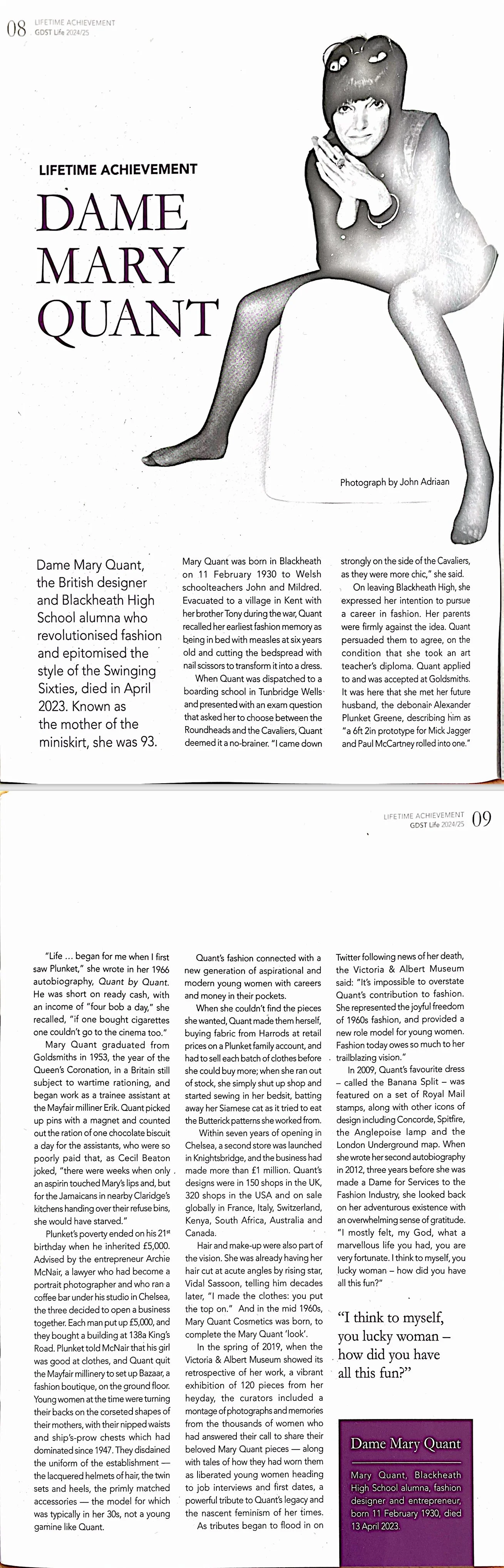 If you’re a fan of Mary Quant you might also be interested in this tribute to her, printed in her old school magazine (again, big thanks to Fiona for sending this through to me):